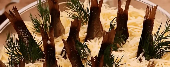 - سالاد را جمع کنید، هر لایه را با یک لایه مایونز سبک بمالید: سیب زمینی، اسپرت، پیاز ترشی، هویج، تخم مرغ و پنیر.